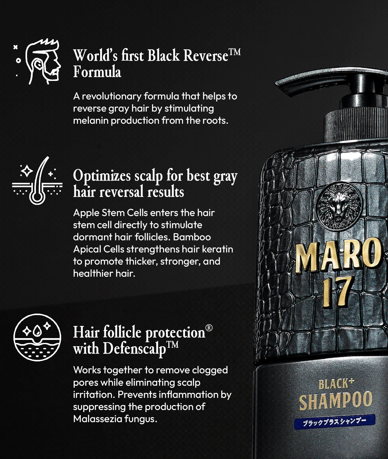 MARO Black+ uses our breakthrough Black ReverseĀ® formula to reverse gray hair and stimulate the scalp to promote a better environment for hair growth in your natural color with Apple Stem Cells and Bamboo. In addition, it eliminates inflammation and irritation while optimizing scalp health and protects follicles and promotes stronger, healthier hair.